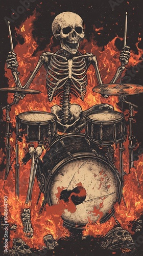 A illustration skeleton playing the drums, flames around him, rock poster style, vector graphics, detailed background elements,