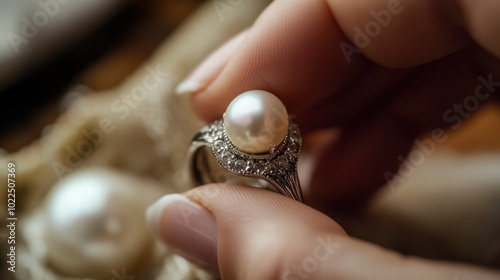 A jewelry designer's hand carefully placing a pearl onto a silver ring mount.