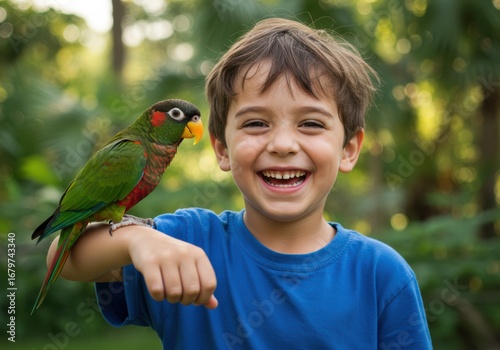 A joyful boy shares a moment with a vibrant parrot, smiling and enjoying the day.