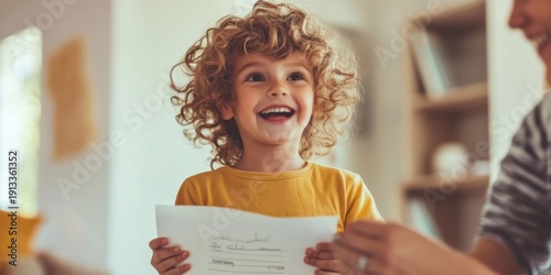 A Joyful Child Enthusiastically Holding a Certificate in a Bright and Colorful Living Room