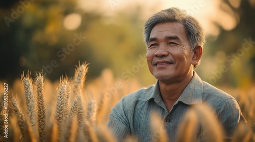 A joyful farmer reviews his thriving crop, basking in the warmth of natural light