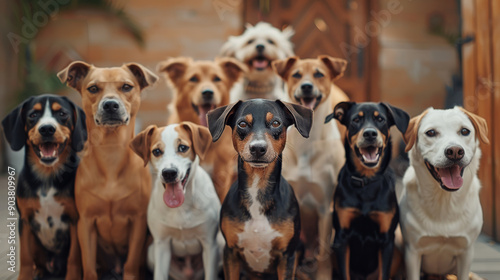 A joyful group of dogs posing together, showcasing a diverse range of breeds and sizes, with expressions of happiness and playful curiosity on their faces.