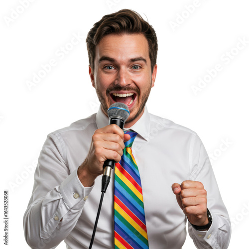 A joyful man sings into a microphone with a rainbow tie, full of energy.