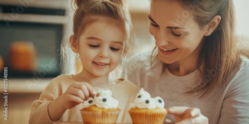 A joyful moment of a mother and daughter decorating cupcakes together in a cozy kitchen, showcasing love and creativity.