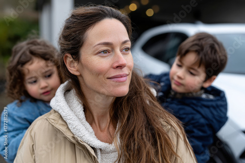 A joyful mother carries her two kids on her back, embodying the carefree and loving essence of family life, showcasing the energy and vibrancy of their everyday adventures.