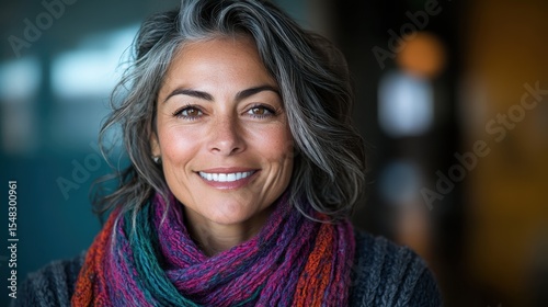 A joyful woman with gray hair smiles warmly in a cozy environment, her colorful scarf adding a touch of vibrancy and representing the beauty of aging gracefully.