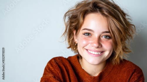 A joyful young woman with a charming smile showcases her natural beauty, highlighting her curly hair and warm expression against a simple, light background.