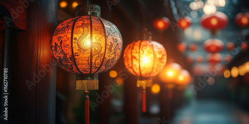 A joyous Chinese New Year celebration honoring the wood snake zodiac. Festive lanterns hang from wooden beams, and a carved snake centerpiece brings blessings of luck and prosperity.