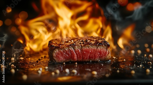 A juicy, seared steak on a hot grill surrounded by flames, seasoned with spices, creating a mouth-watering scene of culinary perfection.