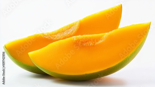 A juicy slice of mango with its vibrant orange flesh and sweet aroma, Each slice’s rich color and subtle imperfections captured with precision