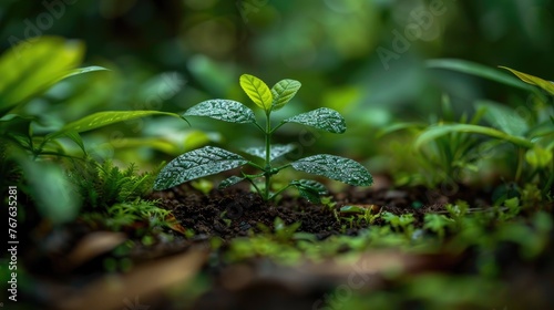 A juvenile plant with glistening water droplets represents growth, resilience, and sustainable ecosystems in a forest ground