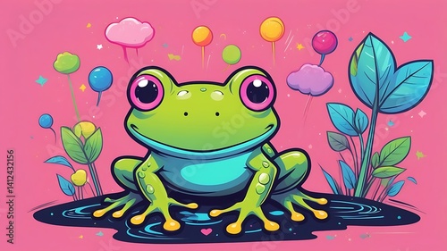 A kawaii-inspired pop art frog logo with pastel neons and playful doodles