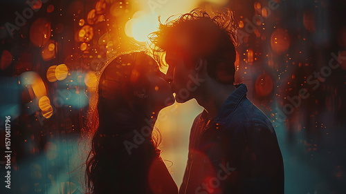 a kiss of a couple in love on a blurred sunny background, a gentle bokeh in warm soft tones