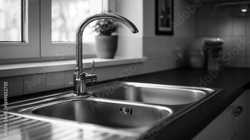 A kitchen sink with a stainless steel faucet and a black and white picture of a sink isolated on white background
