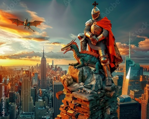 A knight in armor stands on a rooftop in a modern city, with a dragon perched on his shoulder and another flying in the background.