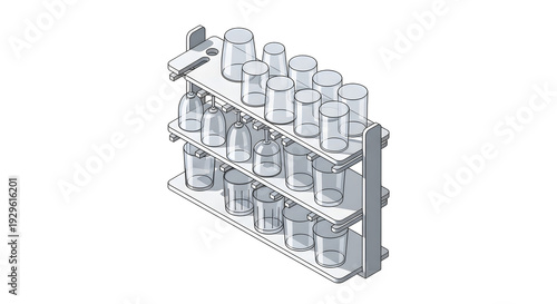 A laboratory rack holding multiple glass beakers and bottles, illustrating a scientific or research setting