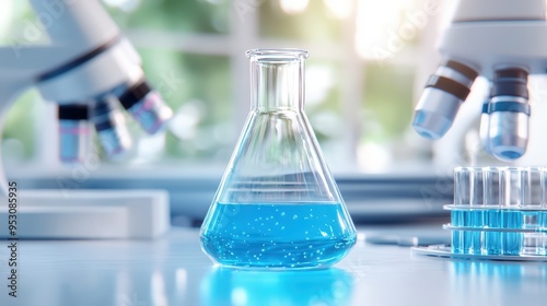 A laboratory scene featuring a clear flask with blue liquid, highlighting scientific tools and a clean workspace.