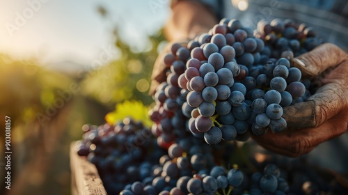 A laborer holds up a bunch of freshly picked purple grapes, demonstrating the close-up view of the fruit’s plump, juicy texture during harvest time in the vineyard.