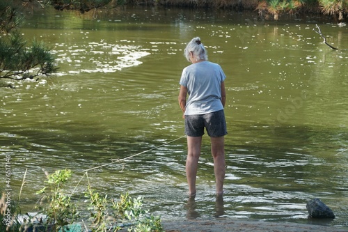 A lady crabbing using a line on the shallow water near Assateague Island, Maryland, U.S.A
