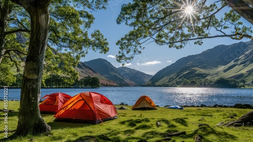 a lakeside camping experience, two tents are situated on vibrant green grass under trees, providing a stunning vista of a tranquil lake, grand mountains, and sun rays casting a magical light.