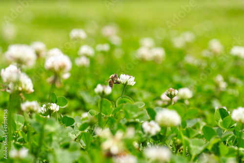 クローバの花にミツバチが蜂蜜を集めに飛んでいる風景