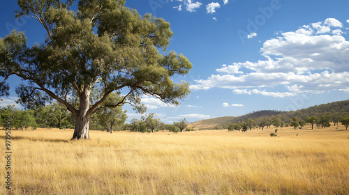 A landscape of the Australian Outback with large, drought-resistant trees and native grasses thriving in the harsh conditions