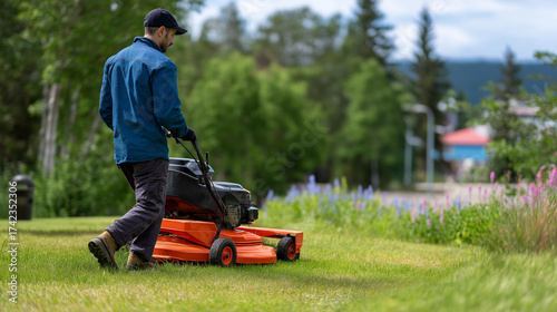 A landscaper operates commercial lawn mower across large property wearing ear protection and work boots while maintaining grounds in professional capacity landscaping work