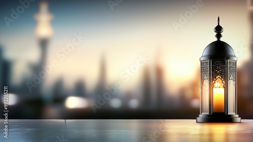 A lantern is lit on a table in front of a city skyline