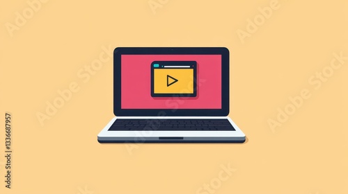 A laptop is showcased with a vibrant screen displaying a media player interface featuring a prominent play button on a contrasting background