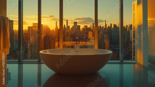 A Large Bathtub Sitting in Front of a Large Window Overlooking a City - Generative AI