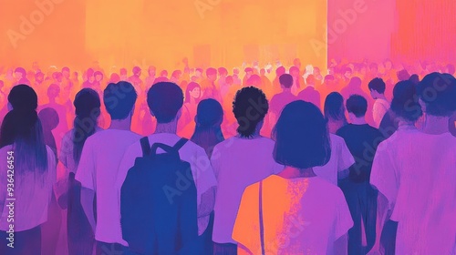 A large, colorful crowd stands together, captivated by a music event, surrounded by a warm, glowing atmosphere