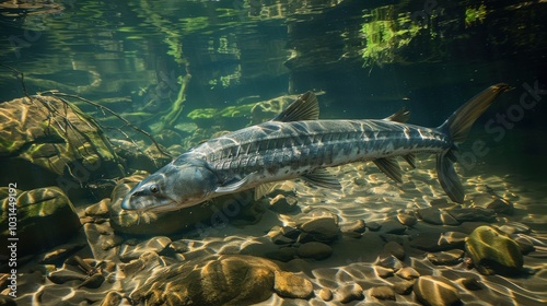 A large fish is swimming in a river with rocks and gravel