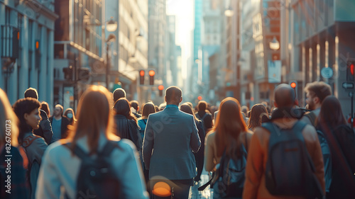 A large group of office workers go to work. Crowded streets of business districts. Blurred office background.
