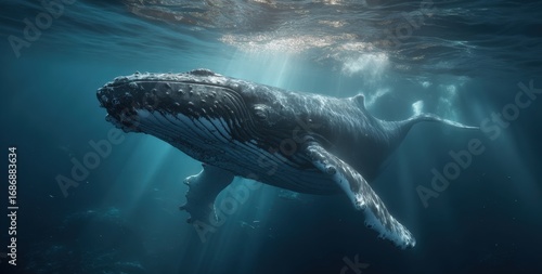 A large humpback whale glides serenely through the deep blue ocean, surrounded by shafts of light filtering from the surface. Its massive body moves with grace in the tranquil waters