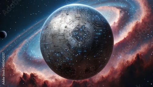 A large, metallic sphere is floating in space. The sphere is surrounded by a cloud of dust and debris, and the sky is filled with stars. Concept of wonder and awe at the vastness of the universe