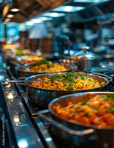 A large number of bowls of food are on a stove. The bowls are filled with various types of food, including pasta
