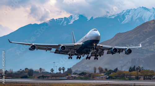 A large passenger plane is landing at an airport with a mountainous backdrop.