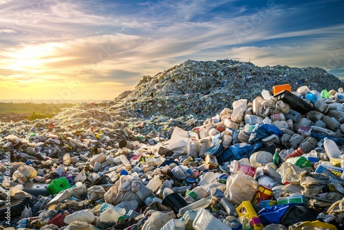 A large pile of garbage under the suns rays, highlighting the environmental issue of waste pollution