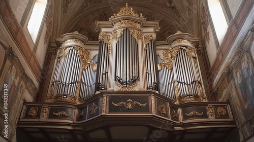 A large pipe organ inside a historic church, showcasing its intricate design.