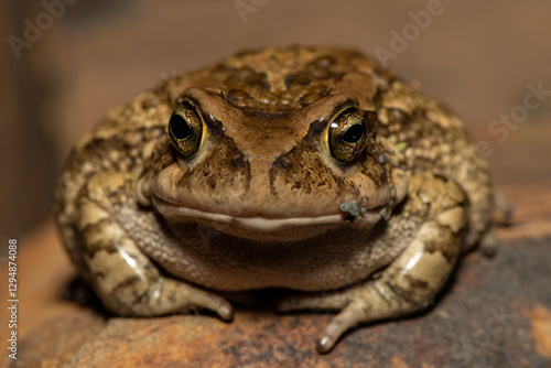 A large raucous toad (Sclerophrys capensis), also known as a Ranger’s toad, on a warm summer’s evening in the wild