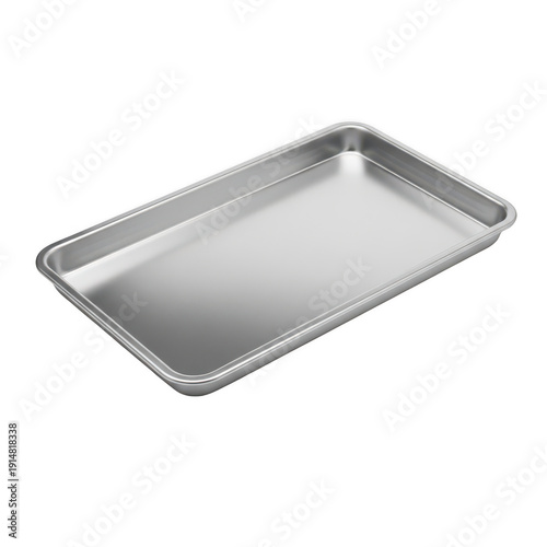 A large, rectangular, stainless steel baking sheet with a shiny finish isolated on transparent background