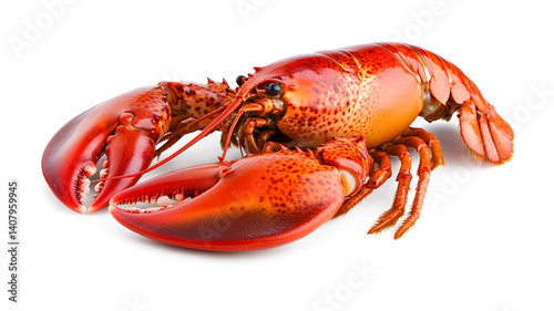 A large red lobster with black spots on its body. The lobster is sitting on a white background