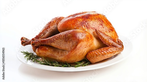 A large roasted turkey is sitting on a white plate