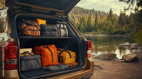 A large SUV trunk open with outdoor gear inside, showcasing the vehicleaes storage capacity and versatility for adventurous lifestyles.