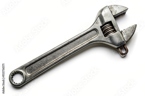 A large used wrench seen from a bird s eye view is isolated on a white background, adjustable, mechanical engineering, industrial, turn, metal, isolated, white background, bird's eye view