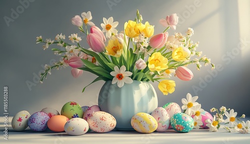 A large vase with tulips, daffodils, and other spring flowers arranged in it