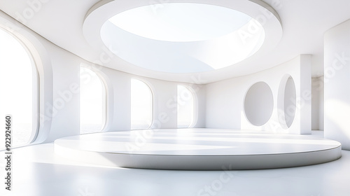 A large white circular stage with a podium on the ground, surrounded by arched windows and a round skylight in front of it. The background is an open sea view, creating a minimalist style.