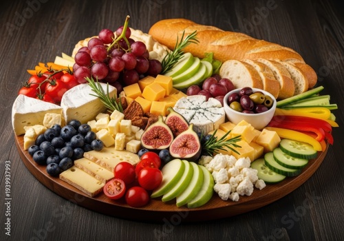 A large wooden platter filled with cheese and fruit
