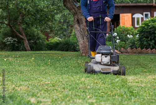 A lawn mower man mows the grass in the backyard. Agricultural machinery for garden maintenance. The concept of gardening and country life. The banner.