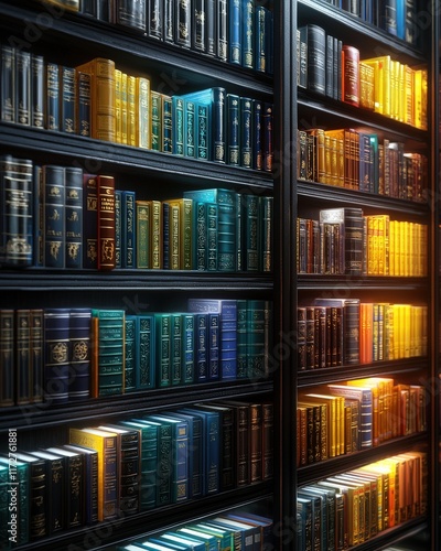 A library filled with colorful books, glowing softly under warm, ambient lighting